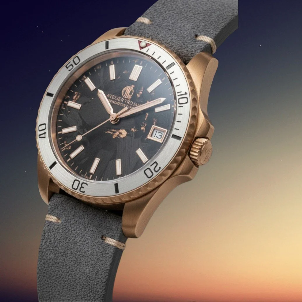 Atelier Trojan unites generations, cultures and emotions through a shared passion for watchmaking. Grounded in Swiss and Japanese craftsmanship and guided by a timeless design philosophy, the brand seamlessly connects past and present with exceptional attention to detail. Each timepiece is crafted to spark emotion and bring stories—and people—together. Explore our story, our values, and the individuals who shape the brand..